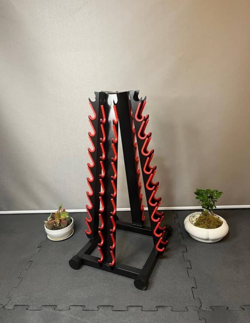 این نوع رک برای قرار دادن دمبلها در جهت افقی طراحی شده است. دمبلها در طول رک قرار میگیرند و به صورت مرتب و متوالی در آن قرار داده میشوند.رک دمبل عمودی:
